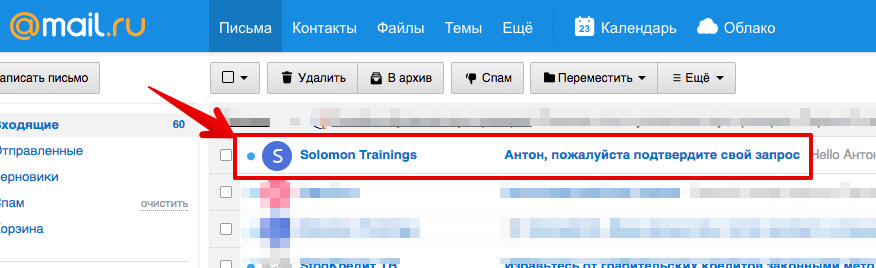 2. Найдите письмо от "Solomon Trainings" с подтверждением запроса.